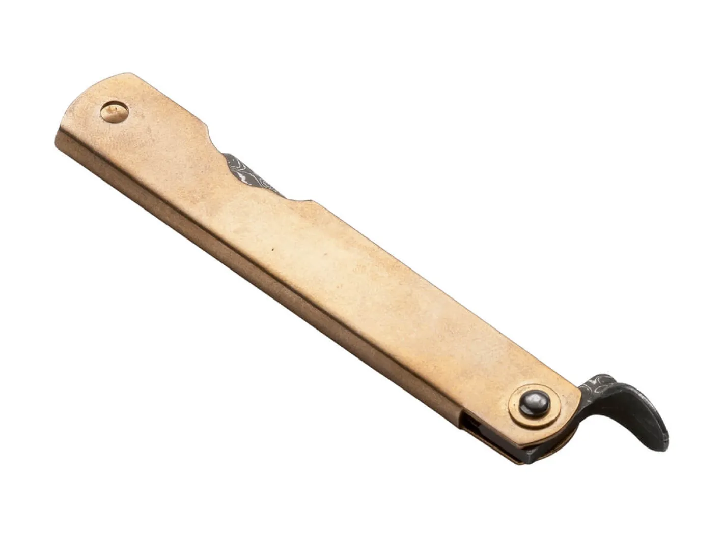 Der gefaltete Griff des Higo Hoseki Damascus wird aus Messing gefertigt und ist mit einer dezenten Fangriemenöse ausgestattet. Die schmale Klinge besteht aus hochwertigem Damast.
