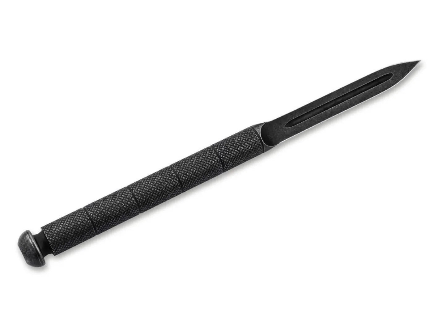 Der Sleeve Dagger (auch bekannt als Bodkin oder Nail Dagger) war eine im 2. Weltkrieg vom britischen Geheimdienst SOE (Special Operations Executive) hauptsächlich für verdeckte Operationen in Zivil entwickelte Stoßwaffe. Die einteilig ohne Parierelement aus einem Stück zylindrischem Stahl gefertigte Konstruktion sollte wenig auftragen, um verdeckt geführt und im Idealfall bei einer Gefangennahme als Fluchtwaffe sogar übersehen bzw. übertastet zu werden. Für den Sleeve Dagger gab es kein einheitliches Produktionsmuster. Er wurde in einzelnen Klein- und Kleinstserien von verschiedenen Erzeugern hergestellt. Die erste Charge soll von einem Londoner Juwelier mit Erfahrung in der Herstellung von Brieföffnern angefertigt worden sein.Gemeinsame Merkmale aller Exemplare waren die dreikantig geschliffene Klinge und der nagelartig schlichte Aufbau. Die Griffe konnten vollständig rund oder leicht rechteckig sein. Die Griffoberflächen waren zum Teil vollständig glatt oder bei einigen Serien mit einer Struktur von Kreuzhieben (Checkering) und teilweise zusätzlich von einigen wenigen umlaufenden Rillen strukturiert. Fast immer gab es vor dem knaufartigen Abschluss eine umlaufende Vertiefung, in die eine Lederschlaufe als Ersatz für die fehlende Parierstange geknüpft werden konnte. Der Knauf am Griffabschluss hatte entweder denselben Durchmesser und Querschnitt wie der Griff oder war leicht verbreitert und stand pilzförmig über.Zum verdeckten Tragen hatten die Sleeve Dagger eine Lederscheide mit zwei Schlitzen zur Aufnahme eines Lederriemens, um unter der Kleidung nach Art eines Tauchermessers am Unterarm (daher der Name Sleeve = Ärmel) oder am Bein getragen werden zu können. Der einzelne lange Lederriemen wurde dabei achtförmig um Arm oder Bein geschlungen.Zur Fertigung des HKT Sleeve Dagger wird ein historisch korrekter, schlichter Kohlenstoffstahls verwendet. Die Wahl ist auf den hervorragenden Lagerstahl GCr15 mit 1% Kohlenstoff gefallen. Das Finish ist ein dunkles Acid Wash, das eine antike Erscheinung entstehen lässt. Die Spitze ist dreiseitig scharf geschliffen. Alle drei Seiten sind mit einer Hohlkehle versehen. Der Dagger hat ein Checkering und vier umlaufende Rillen zur Verbesserung der Griffigkeit. Der überstehende Pilzknauf (Durchmnesser 16 mm, Griffdurchmesser 13mm) ist mit einer tiefen Einschnürung zur optionalen Befestigung einer Lederschlaufe abgesetzt.Der HKT Sleeve Dagger wird mit einer den Originalen entsprechenden braunen Lederscheide mit langem Lederriemen mit Dornschließe geliefert.