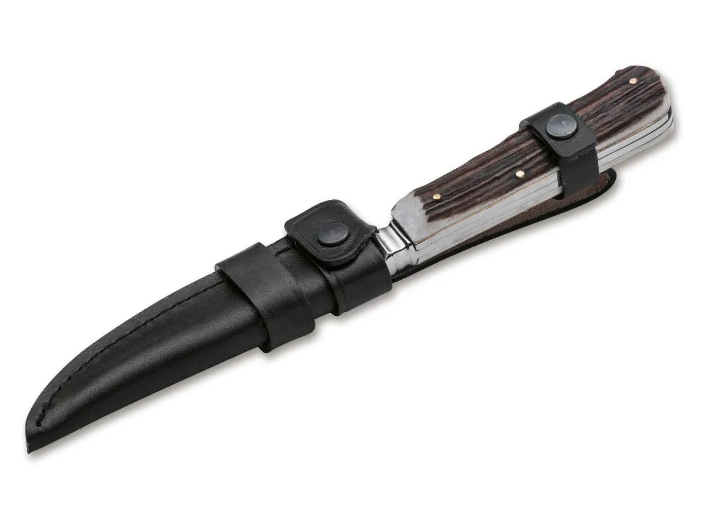 Nach wie vor erfreuen sich klassische feststehende Nicker mit ausklappbaren Zusatzwerkzeugen im Griff großer Beliebtheit. Dieser Hirschhorn-Nicker mit 11 Zentimetern Klingenlänge ist mit einer Säge mit zusätzlichem Kapselheber und Schraubendreher ausgestattet. Lieferung mit klassischer Nickerscheide mit abnehmbarer Gürtelschlaufe. Als Klingenstahl kommt 4109 zum Einsatz.