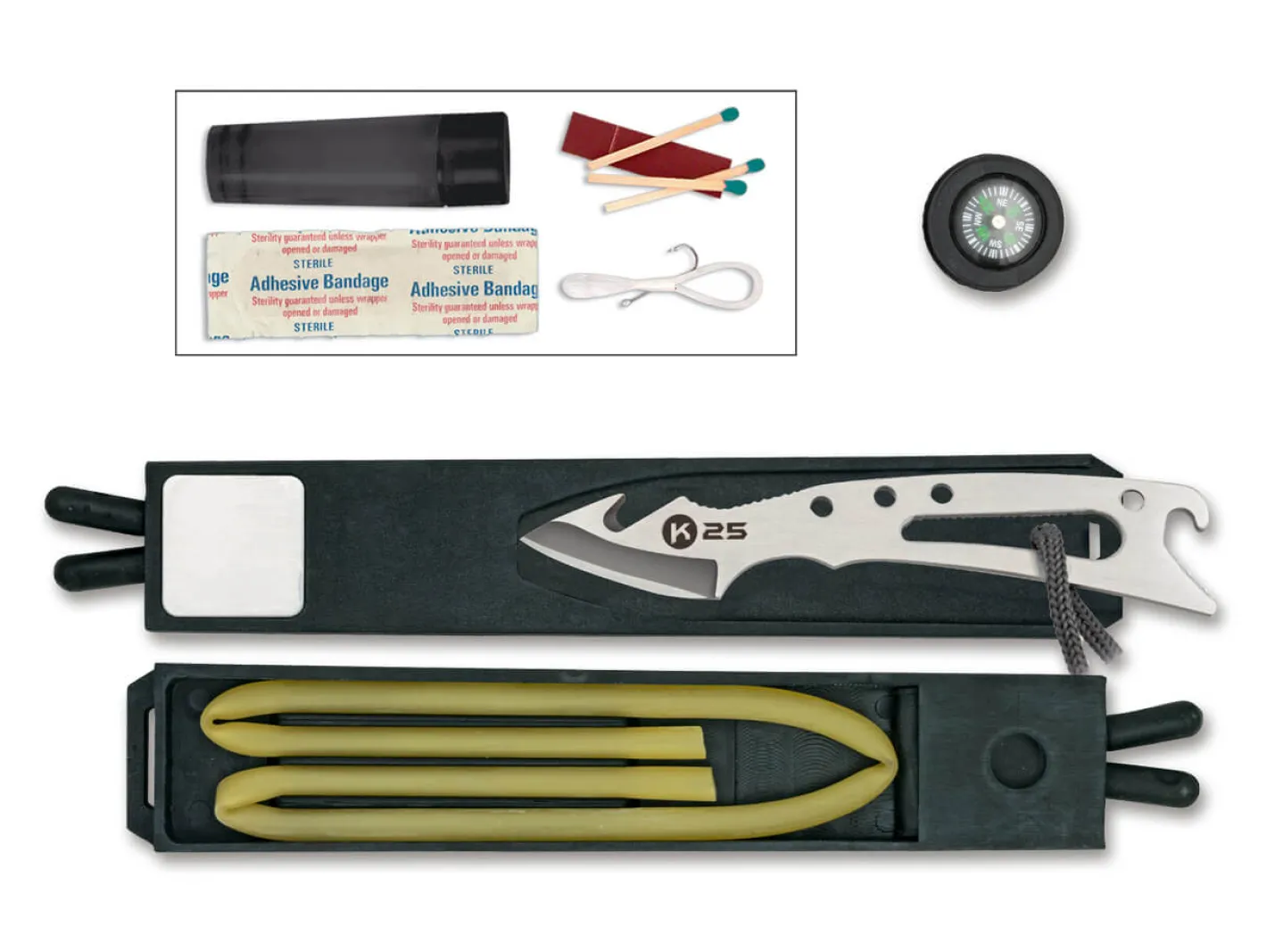 Das K25 Thunder ist ein Überlebensmesser mit einem Survival-Notfallset im Hohlgriff, der durch eine Schraubkappe mit integriertem Kompass verschlossen werden kann. Die Klinge des Fahrtenmessers wird aus 8Cr13MoV gefertigt und titanbeschichtet. Sie verfügt über ein markantes Two-Tone Finish und eine Rückensäge. Der beidseitige Handschutz verhindert ein Abrutschen auf die Klinge, und der strukturierte Kunststoffgriff optimiert die Griffigkeit. Die bis ins letzte Detail durchdachte Multifunktionsscheide beherbergt zusätzliche Notfallausrüstung sowie eine Schleuder und ist auch ohne das Messer vielseitig einsetzbar. Ausgeliefert wird das Thunder II mit einem vielseitig nutzbaren Beimesser mit Zusatzfunktionen, das auch als Harpune eingesetzt werden kann.