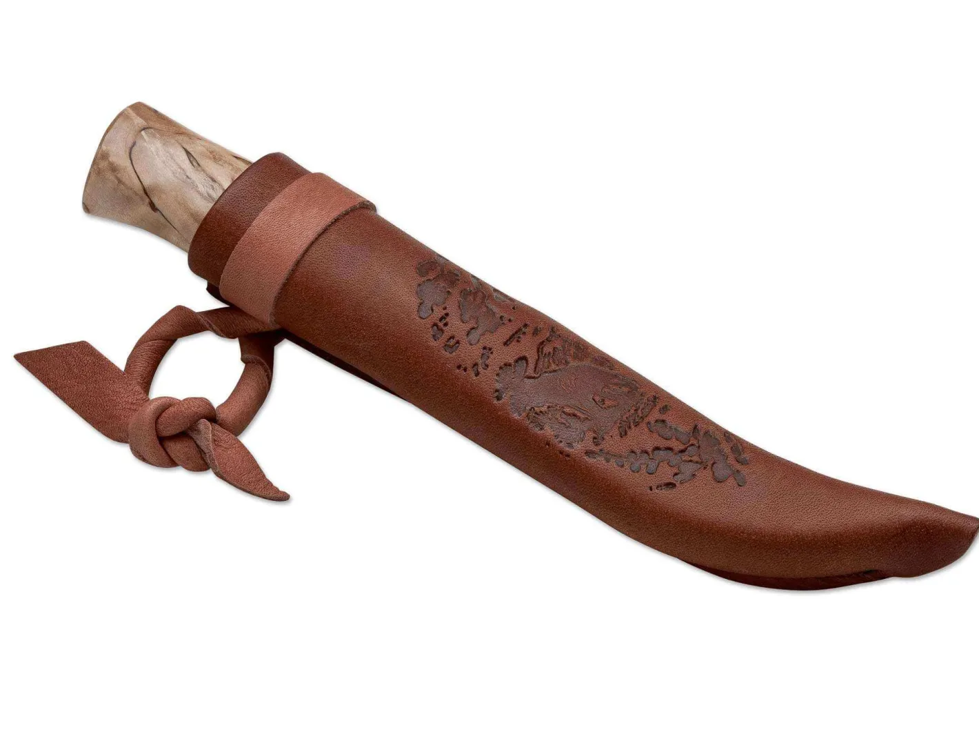Klassisches Finnenmesser mit kleiner Fingermulde und Messingabschluss. Der Griff besteht aus geölter Maserbirke und Rentierhorn. Traditionelle Lederscheide nach samischer Art mit Lederriemen (ohne Gürtelschlaufe) und Elchprägung. Mit Kunststoffeinsatz.