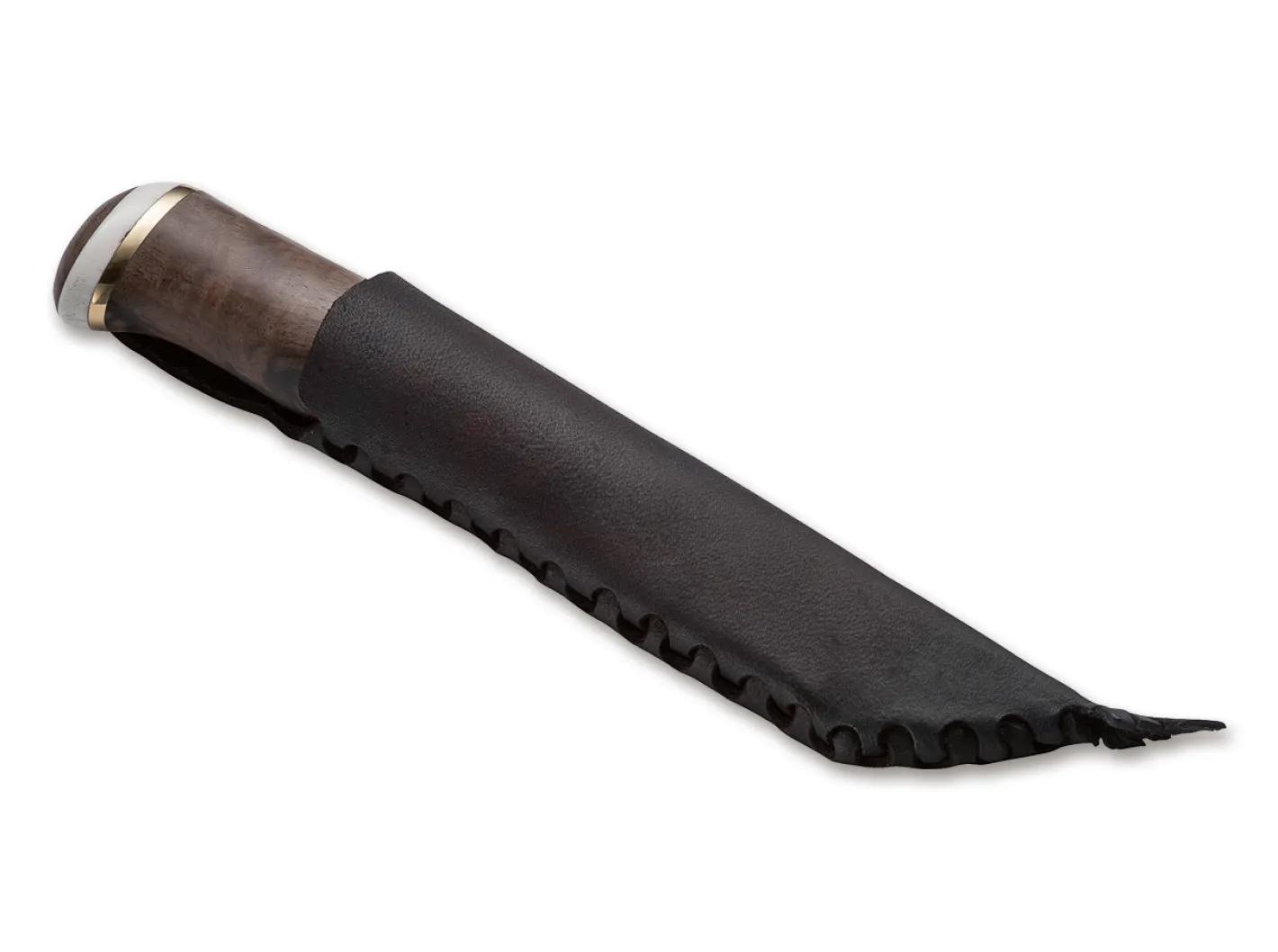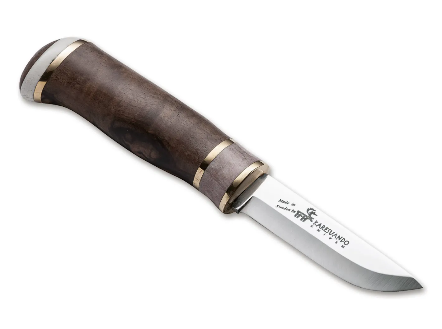 Im Lappländischen Dialekt „Meijän Kieli“ bedeutet „Hieno“ schlicht: Wunderschön! Auf den ersten Blick sieht man, dass dieses Fahrtenmesser seinem Namen alle Ehre macht und Karesuando hiermit eine ganz neue Stufe von Verarbeitung und Finish erreicht. Der handschmeichelnde Griff aus Holz, Messing, Rentier-Horn und dem ebenfalls aus Messing gefertigten Emblem im Knauf ist fugenlos zusammengesetzt und perfekt poliert. Die Klinge mit traditionellem Scandi-Schliff aus dem bewährten Sandvik 12C27 hat die optimale Länge für alle Outdoor- und Bushcraft-Arbeiten. Ein besonderer Clou ist die schlanke und passgenaue Scheide, die ohne Keder, Naht oder zusätzliche Lederschnur aus einem Stück Leder geschnitten und genial geflochten ist. Der Griff aus Walnussholz besticht durch die warme Farbe und ruhige Struktur.
