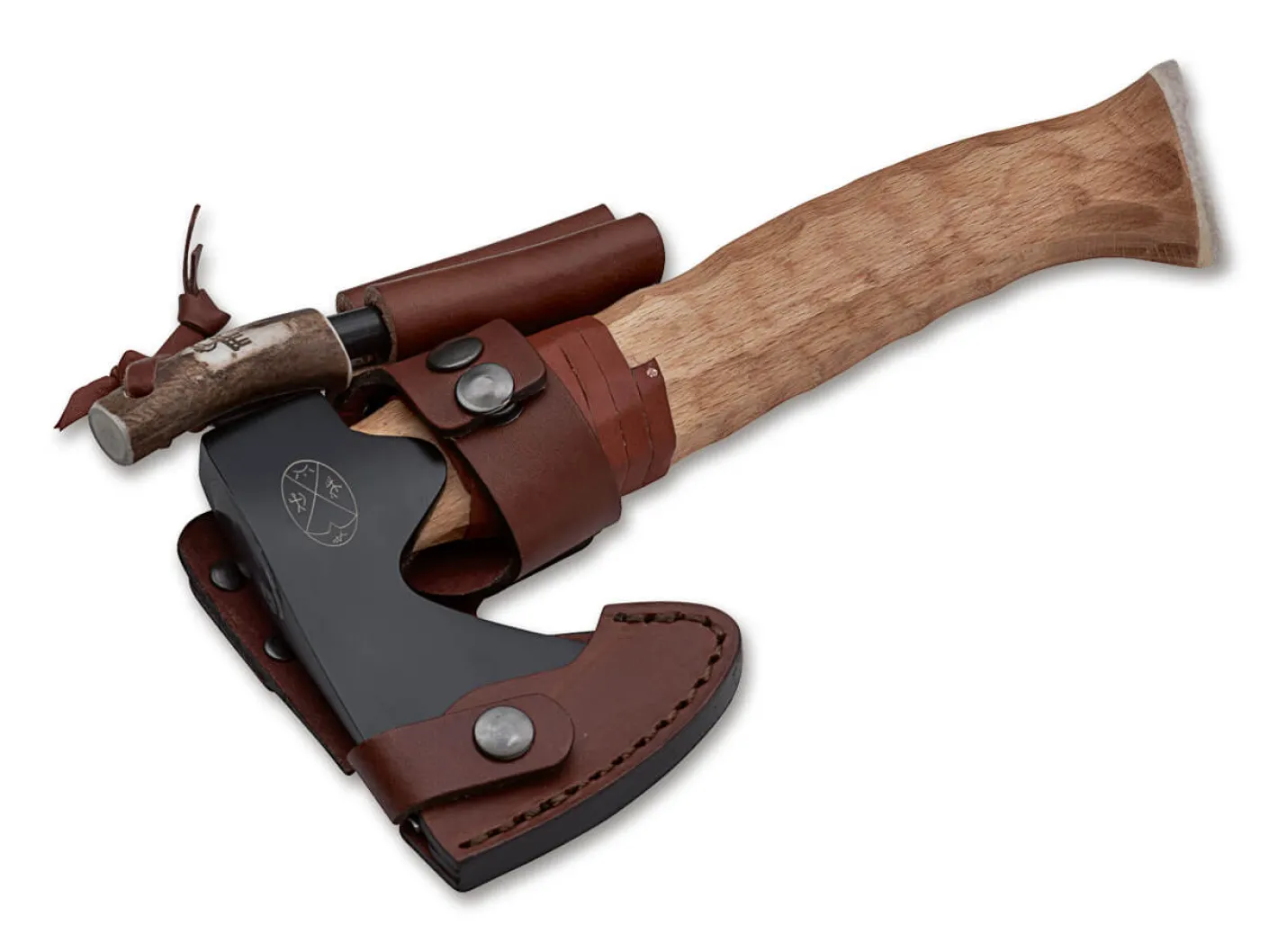 Mit der Mettämies Bushcraft Axt bietet Karesuando eine modifizierte Variante der überaus beliebten Unna Aksu an, die speziell für Bushcrafter optimiert wurde. Der Stiel wird aus Rotbuchenholz gefertigt, das eine sehr hohe Festigkeit besitzt und zudem Schockbelastungen beim Hacken noch besser verträgt. Der Stiel wird von Hand behauen und liegt extrem griffig in der Hand. Zusätzlich wird er durch gebundenes Rentierleder geschützt. Der aus hochwertigem 5Cr15MoV gefertigte und auf 56 HRC gehärtete schwarz lackierte Axtkopf weist einen modifizierten Anschliff auf, der ebenfalls vorrangig auf Hacken ausgelegt ist. Die braune Lederscheide schützt den rostfreien Axtkopf beim Transport. Der Griffabschluss aus Elchknochen rundet die robuste Bushcraft Axt gekonnt ab.Das Set besteht aus der Mettämies Axt, einem hochwertigen Kombiholster aus braunem Leder, einem handlichen Schärfer und einem Feuerstarter.