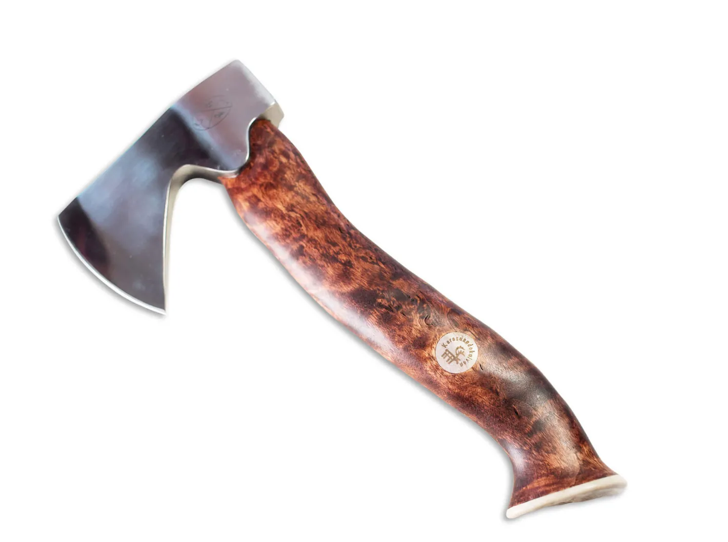 Der große Bruder des kleinen Jagdbeils von Karesuando mit dem größeren und schwereren Kopf ermöglicht in Kombination mit der auf 30 cm gewachsenen Gesamtlänge auch gröbere Arbeiten, wobei die jagdliche Nutzung auch bei der „Stoera Áksu“, der „Großen Axt“, im Vordergrund steht. Auch hier ist die Befestigung des Kopfes am Stiel komplett hygienisch versiegelt. Griff aus dunkel gebeizter Maserbirke mit Abschlussplatte und eingelegter Plakette aus Rentierhorn. Rostfreier Axtkopf. Lieferung mit Schärfer und Lederscheide.
