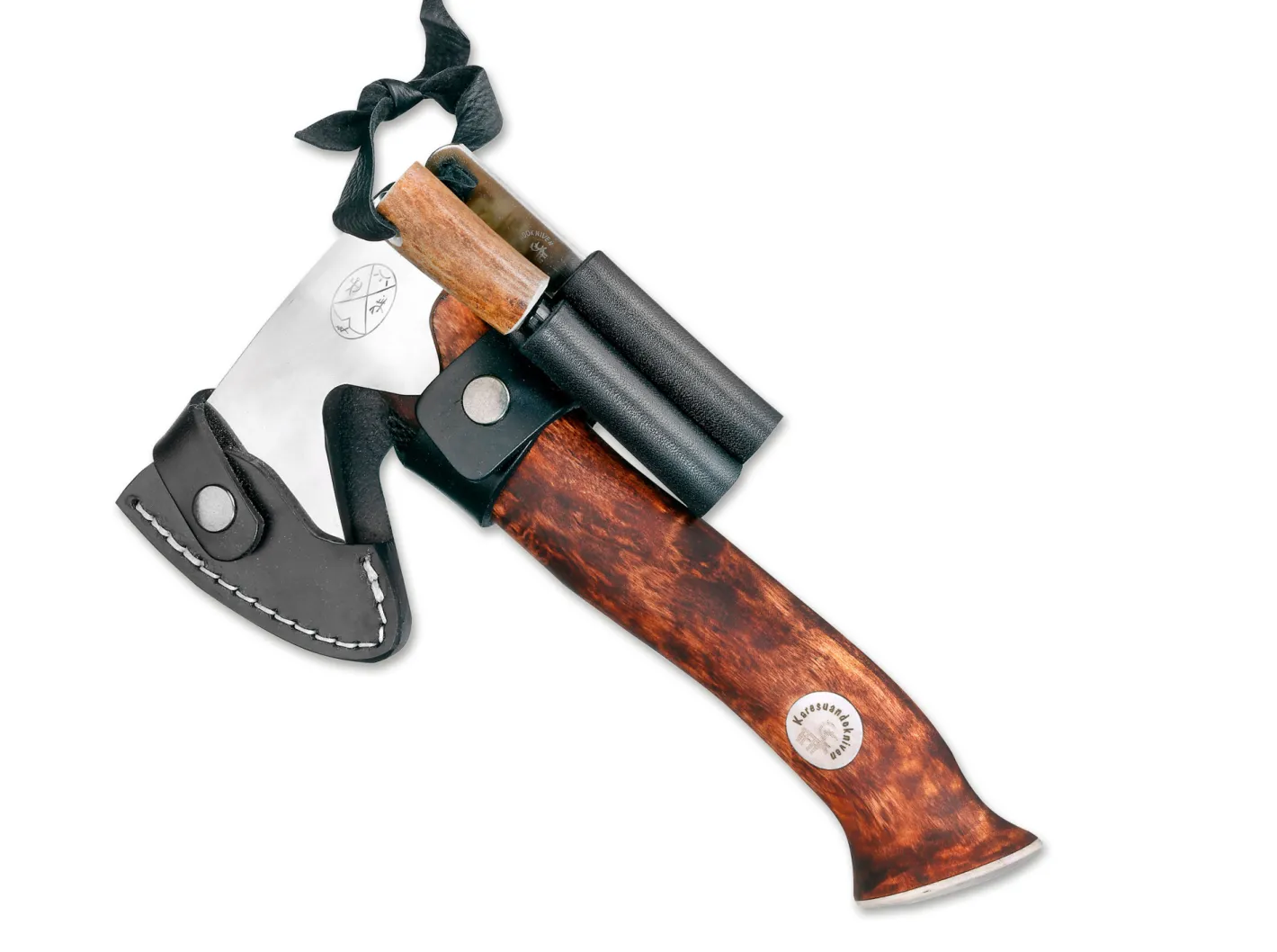 Die Jagdaxt Unna aksu (samisch für „Kleine Axt“) von Karesuando mit ihren überaus handlichen Abmaßen ist ein vielseitig einsetzbares Werkzeug auf der Jagd und im Camp, das durch seine scharf ausgeschliffene Schneide auch wie ein kleines Messer eingesetzt werden kann. Selbst am heimischen Kamin macht sich dieses wunderschöne Stück schwedischer Handarbeit ausgezeichnet. Der Kopf aus rostfreiem Stahl ist auf 55 HRC gehärtet. Der Griff aus Maserbirke besitzt ein eingelegtes Emblem aus Rentierhorn und einen Abschluss aus Elchknochen. Einschließlich einem hochwertigem Kombiholster aus Leder, einem handlichen Schärfer und einem Feuerstarter. Lieferung in hochwertiger Geschenkschatulle.