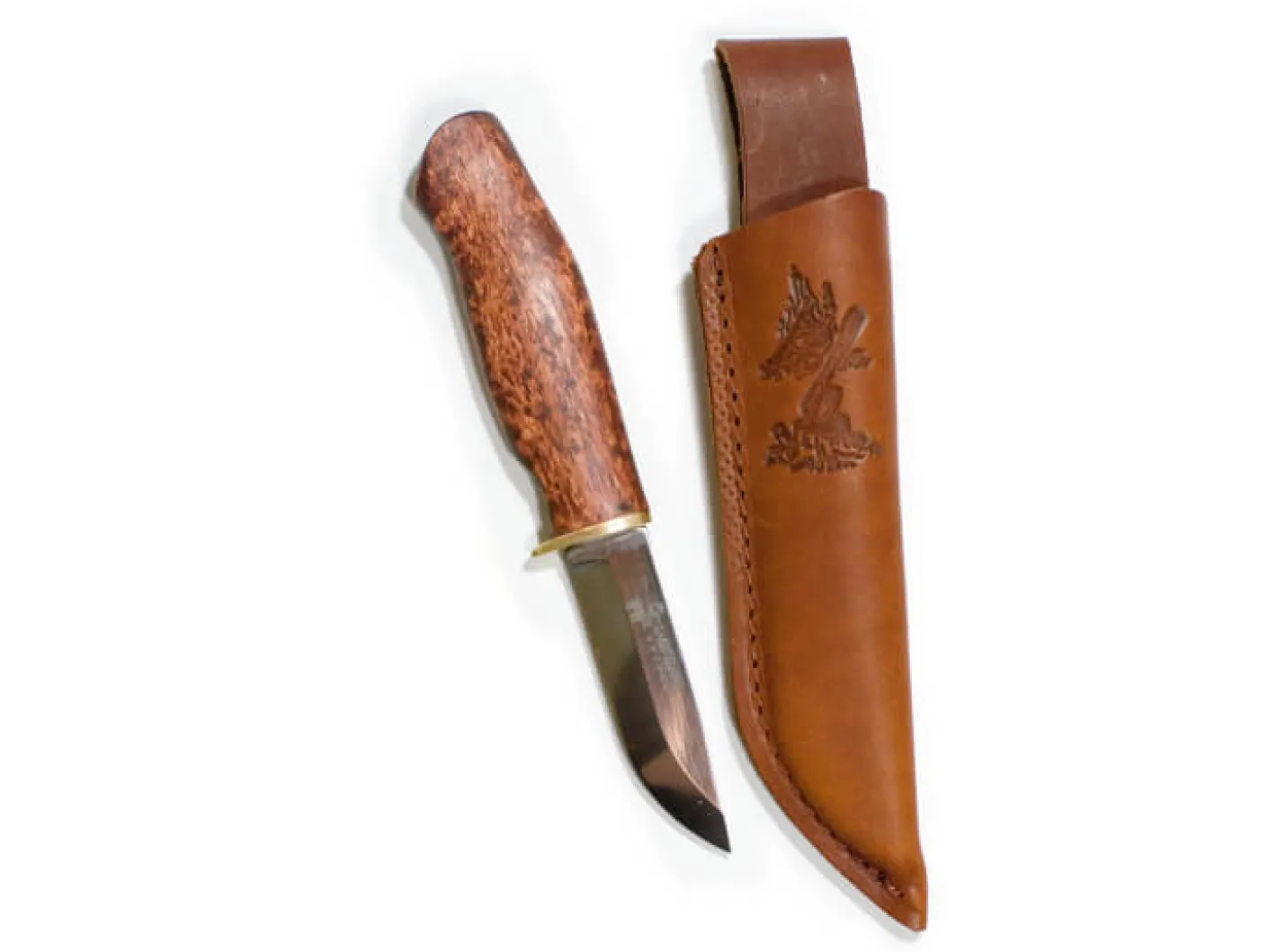 Messergriff aus geölter Maserbirke, Klinge 21 x 83 mm aus rostfreiem Sandvik-Stahl 12C27, gehärtet auf 57HRC. Messerscheide aus Rinderleder mit Kunststoffeinlage.