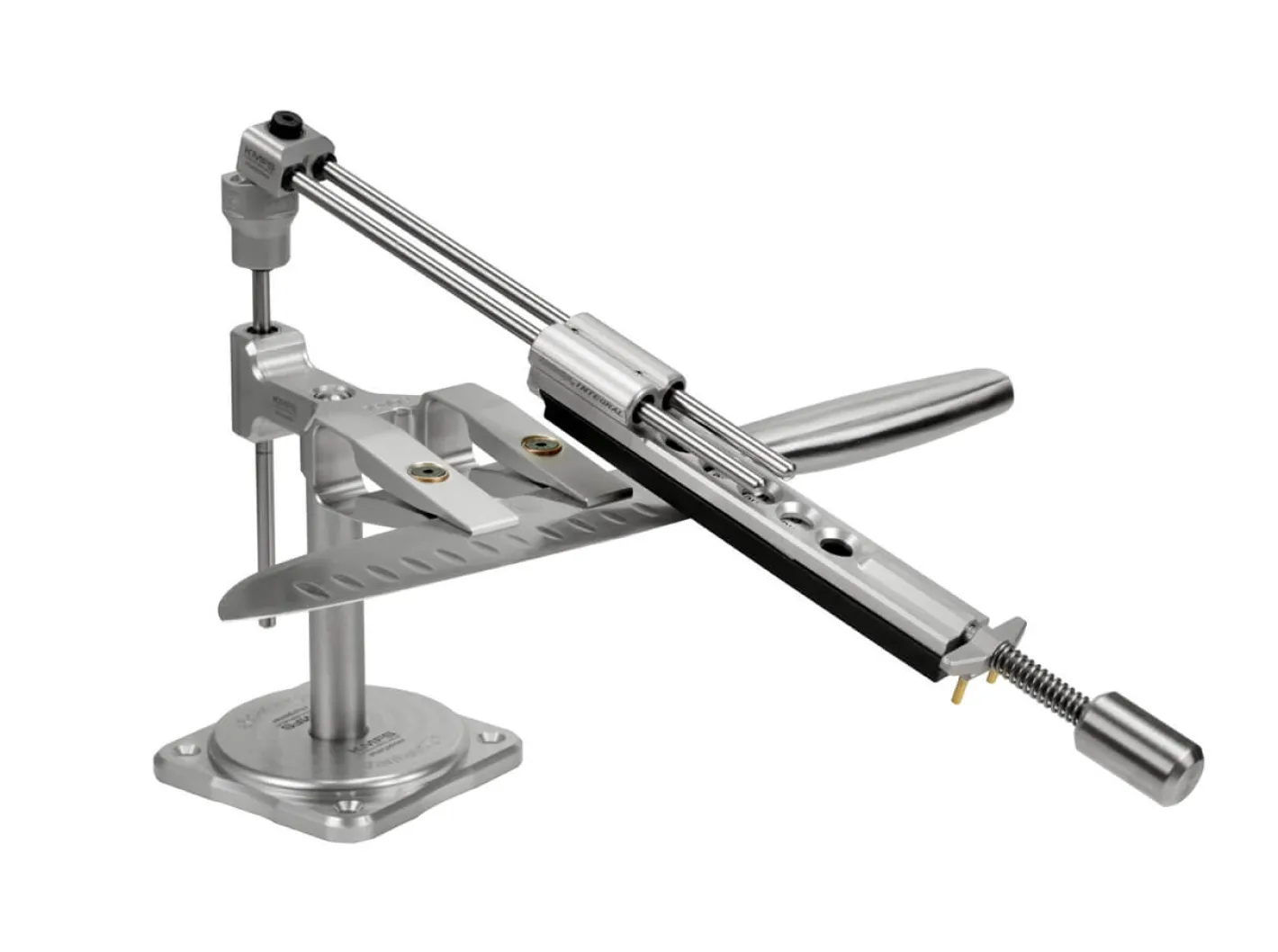 Der KMFS Vantaedge Integral darf im Segment der manuellen Messerschärfer als wegweisend betrachtet werden. Das komplett in der Tschechischen Republik entwickelte und hergestellte Schärfgerät ist das erste seiner Art, das ein absolut präzises Schärfebild des Messers reproduzieren kann, ohne dabei die exakt gleiche Einspannposition des Messers für das Schärfen einzufordern. Die größte Neuerung besteht in der umgekehrten Kinematik, bei der das System auf der Grundlage des exakten Winkels am Messer die anderen Komponenten des Sets so einstellt, dass der Winkel am Messer unabhängig von der Tiefe der Messerspannung immer gleich ist. Das Schleifsystem des Sets umfasst einen Kopf mit Schleifwinkeln von 15°, 17,5°, 20° und 22,5°, die entlang der gesamten Klinge und bei jedem Schliff genau eingehalten werden. Dank der vollständig aus einem massiven Block Aluminium gefrästen Integral-Spannvorrichtung werden eine absolut präzise Ausrichtung des Messers, maximale Festigkeit sowie ein leichtes Einspannen erreicht. Ermöglicht wird dies durch eine doppelte Klemmhalterung, die unerwünschte Klemmkräfte eliminiert und sich perfekte an das Profil der Messerklinge anpasst. Die maximal mögliche Klingenstärke beträgt 8 mm; die maximale Klingenlänge, die in einer Aufspannung geschliffen werden kann, beträgt 20 – 25 cm. Lieferung mit je einer Diamantschleifplatte der Körnung 240, 600 und 1000, Pflegeöl zur Wartung sowie einem robusten Kunststoff-Case zur Aufbewahrung.