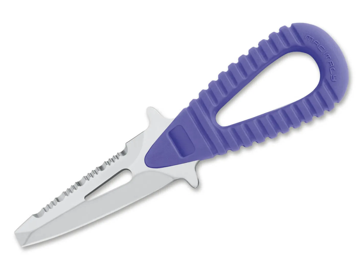Das MAC Microsub PT verfügt über einen kompakten lilafarbenen Kunststoffgriff. Die Meißel-Klinge aus 4116 ist mit einem Wellenschliff am Klingenrücken versehen und ist zusätzlich mit einem Schäkellöser ausgestattet. Mit beidseitig tragbarer, rastender Kunststoffscheide mit Beingurten. Das Messer kann aber auch als Neck Knife getragen werden.