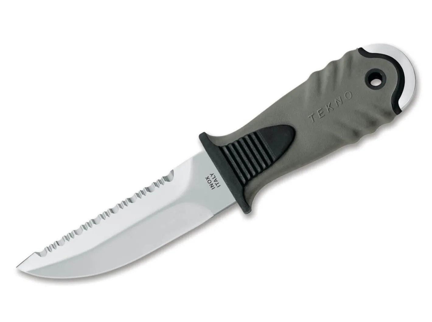 Das professionelle Tauchermesser Tekno von MAC ist mit einer Klinge aus 4116 ausgestattet, die zusätzlich über einen bissigen Wellenschliff verfügt. Der schwarze Griff aus rutschfestem TPE liegt auch unter Wasser sicher in der Hand. Lieferung mit ABS-Scheide mit Gummibändern für Beine oder Arme.