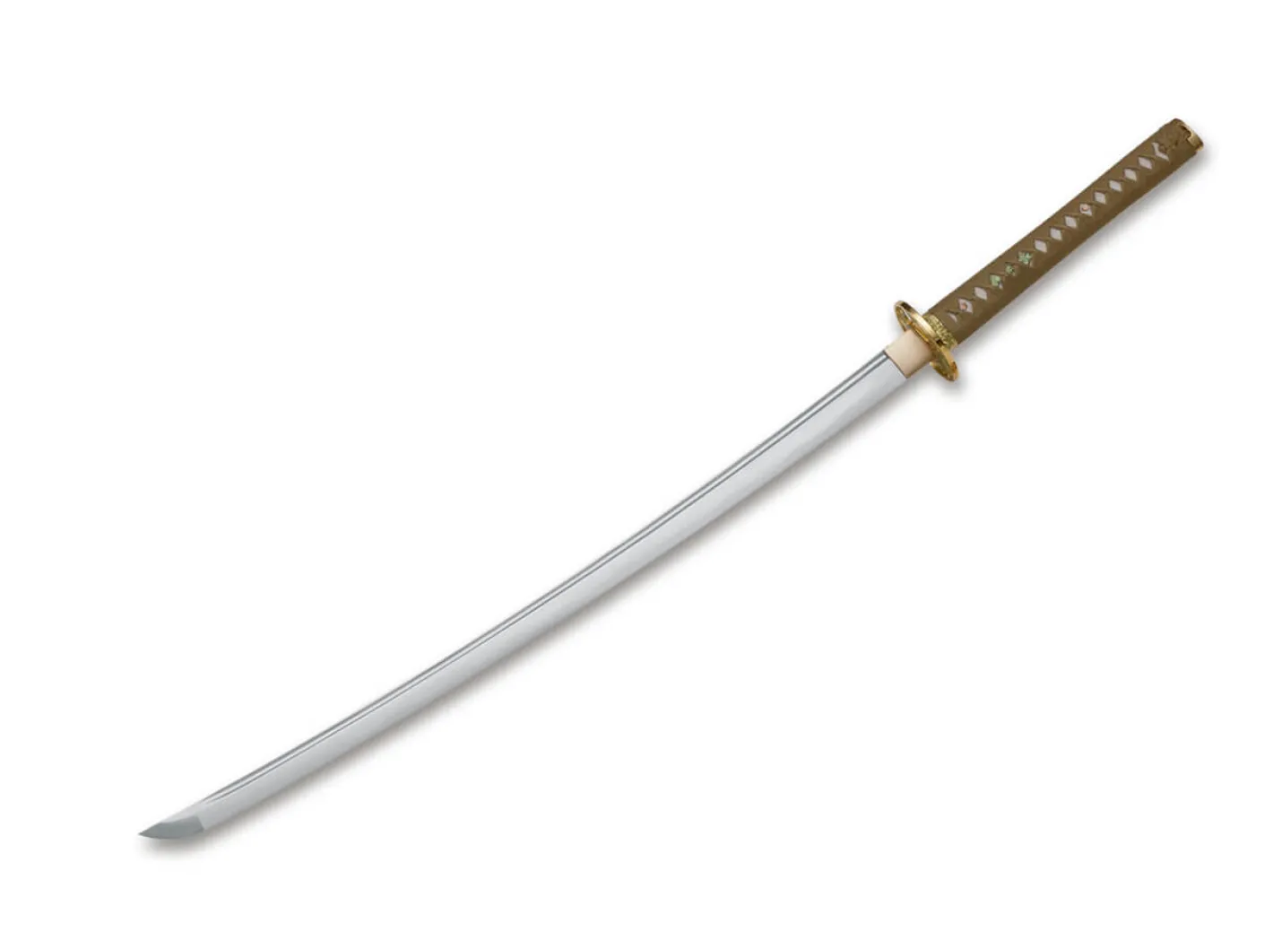 Der Mythos geschmiedeter Samurai-Schwerter ist legendär. In Ergänzung zu unserer Samurai Premium Serie präsentieren wir ein exklusives Katana, welches das Sammlerherz höher schlagen lässt. Durch den Schmiedevorgang erhält jede Klinge ihren individuellen Charakter. Der Griff ist mit echter Rochenhaut unterlegt und anschließend kunstvoll gewickelt. Die sauber lackierte Holzscheide passt zur Farbe der Griffwicklung. Ausgeliefert wird das Schwert in einer traditionellen Holzschatulle, die mit asiatischen Stoffen ausgeschlagen ist. Damit der Wert Ihres Sammlerstücks auch erhalten bleibt, liegt dem Schwert ein Stoffbeutel sowie ein original Reinigungs- und Pflegeset bei. Die goldfarbene Griffwicklung und die goldfarben lackierte Scheide stehen im spannenden Kontrast zur fein satinierten Karbonstahlklinge. Die Tsuba und die Beschläge aus massivem Messing wurden durch eine aufwändige Politur auf Hochglanz gebracht. Wahlweise stehen zwei weitere, unterschiedliche Tsubas zur Verfügung, die im Lieferumfang enthalten sind und selbst gewechselt werden können.Deko- bzw. Sammlerschwert, nicht zum Einsatz geeignet.