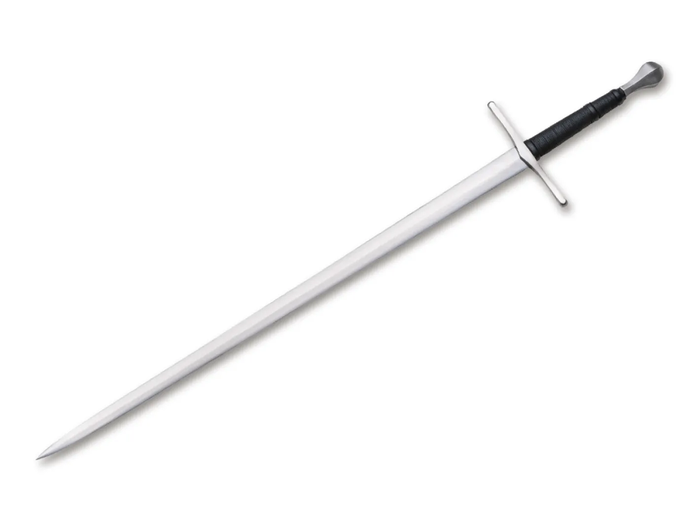 Die gehärtete und abgezogene Klinge dieses einsatztauglichen Schwertes ist flexibel wie sein historisches Vorbild und wird mit viel Liebe zum Detail mit hochwertigem Griff und Edelstahlbeschlägen versehen, so dass das Schwert durch seine Ausgewogenheit und die äußerst edle Anmutung begeistert. Die Authentizität dieser edlen Blankwaffe fasziniert auf Anhieb, und die hochwertige Verarbeitung eines jeden Exemplares macht das Mittelalter wieder lebendig. Ausgeliefert wird das Two Handed Sword mit sauber angepassten authentischen Scheide mit Edelstahlbeschlag. Man muss ein Schwert nicht unbedingt aus einem Stein ziehen, um sich wie ein König zu fühlen! Dieses faszinierende Langschwert beeindruckt nicht nur durch die imposanten Abmaße. Die Balance, die Ausführung des mit Leder und Kordel umwickelten Griffes und die dekorativ abgezogene Klinge aus 1060er Kohlenstoffstahl sind nur einige Features, die das Schwert zu einem Highlight jeder Sammlung machen. Der Mittelgrat lässt den Zweihänder filigran und ausgewogen wirken.Dieser Artikel wird als Sperrgut verschickt.