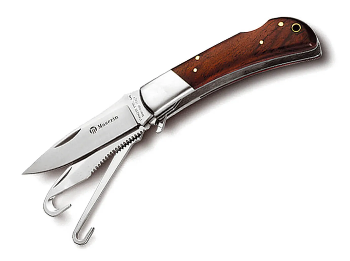 Das Maserin Hunting die 440A Klinge veriegelt über einen Backlock. Die Maserungen des Walnussholz kommen als Griffbeschalung sehr gut zum vorschein. Geöffnet wird die Klinge per Nagelhau. mit Säge und Haken.