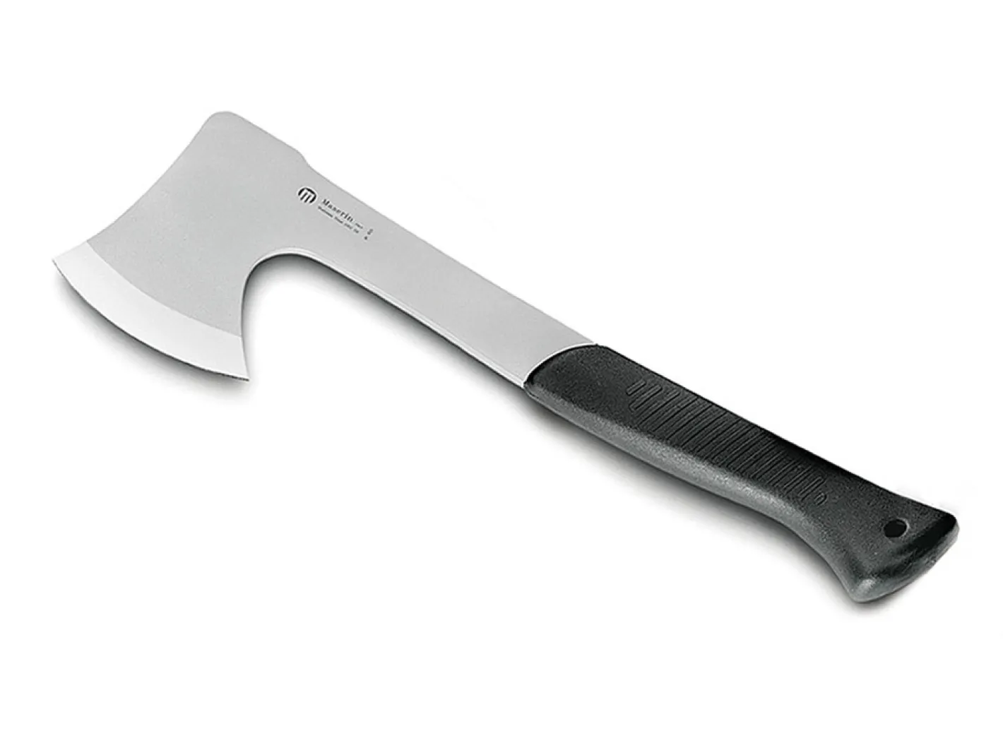 Die Maserin Accetta ist eine kleine und kompakte Axt, hergestellt aus einem Stück Stahl 420. Der rutschfeste Griff aus TPR liegt auch bei Nässe sicher in der Hand. Mit praktischer Lederscheide.