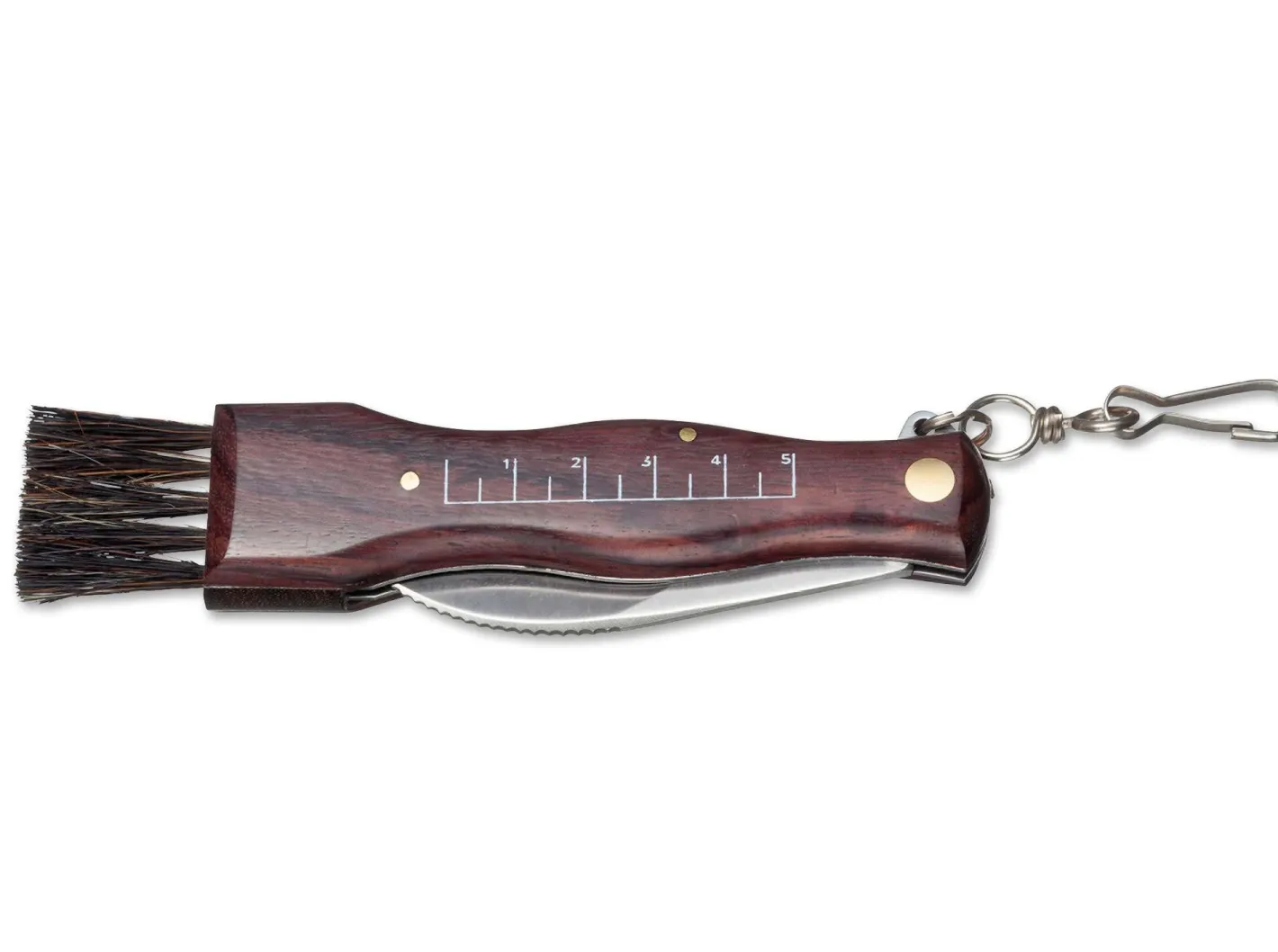 Nicht nur in Italien ist das Sammeln von Pilzen ein beliebtes Hobby. Das typische Pilzmesser verfügt über eine gebogene Klinge, mit denen der Stiel knapp über dem Boden abgeschnitten wird. Ebenso charakteristisch ist die praktische Bürste aus Naturborsten am Ende des Griffes aus Palisanderholz, mit der die Pilze gereinigt werden. Mit Pinzette zum Entfernen von Verschmutzungen und Kette mit Karabiner.