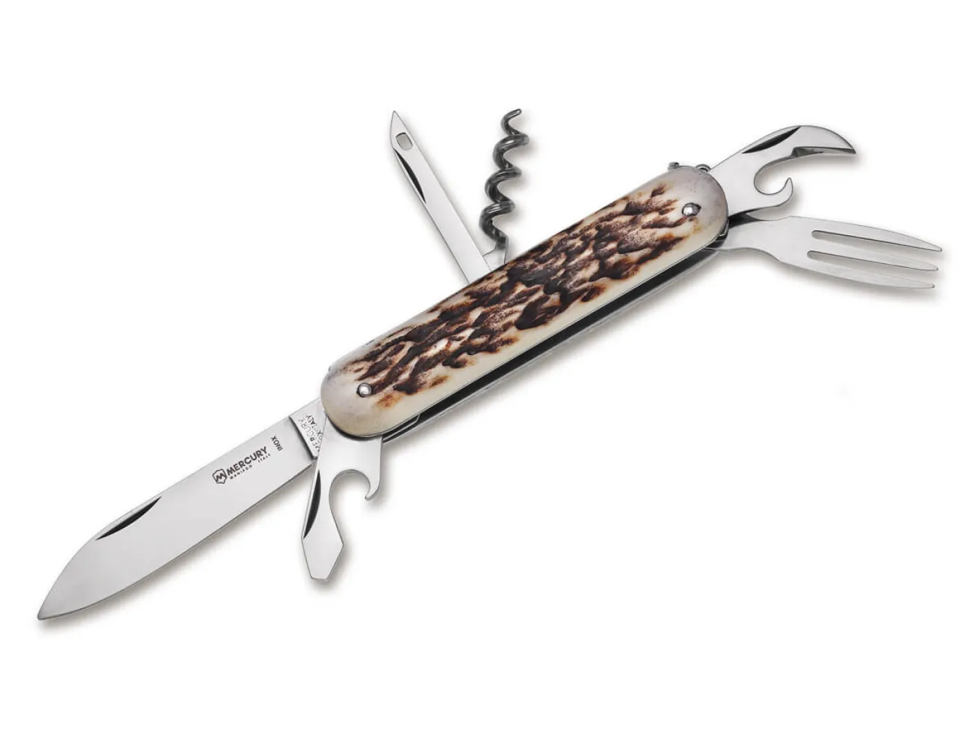 Das klassische Mehrzwecktaschenmesser 913-6DC von Mercury ist mit einer rostträgen Klinge aus 420er Edelstahl, einem Schraubendreher mit integriertem Kapselheber, einem Dosenöffner, einer Ahle, einem Korkenzieher und einer Picknickgabel ausgestattet. Zur Gewichtsersparnis sind die Platinen aus leichtgewichtigem, aber hochfestem Aluminium gefertigt. Als Griffbeschalung kommt Hirschhorn zum Einsatz. Das Slipjoint-Messer besitzen keinen mechanischen Verriegelungsmechanismus, stattdessen wird die Klinge im geöffneten Zustand allein durch eine am Ende des Klingenrückens befestigte Feder zurückgehalten. Wenn die Klinge wieder geschlossen werden soll, muss etwas Druck auf den Klingenrücken ausgeübt werden, um den Widerstand der Feder zu überwinden. Mit Fangriemenöse und Schlüsselring.