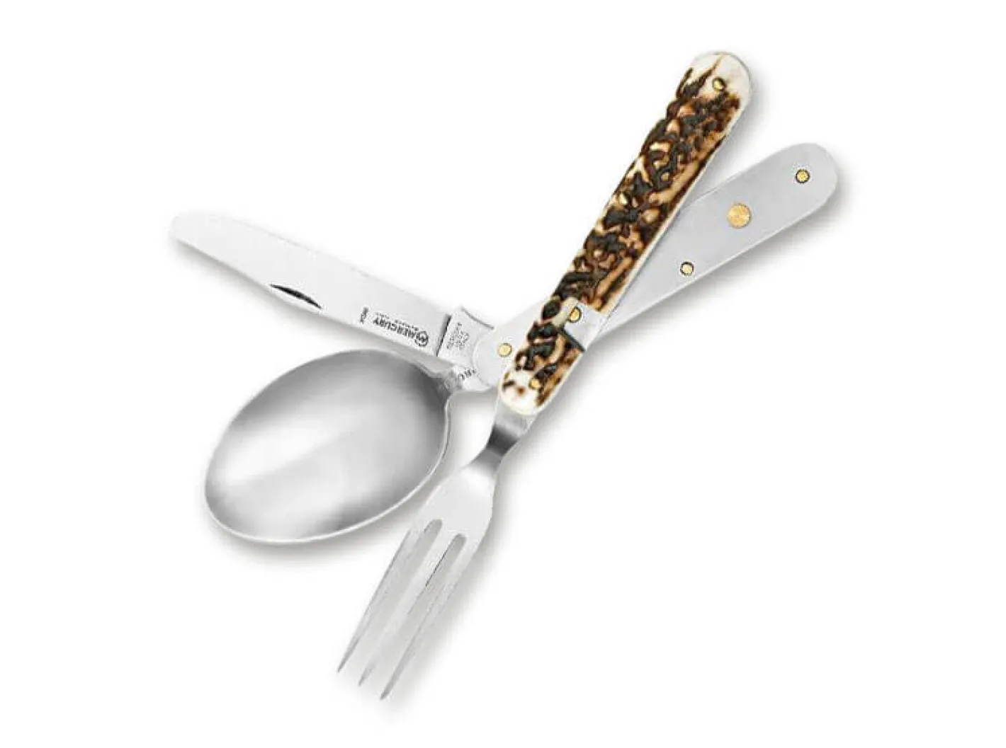 Mercury aus Maniago ist hauptsächlich bekannt für seine klassischen Taschenmesser mit Hirschhornbeschalung. Diesen Ansatz setzt der italienische Herrsteller beim Campingbesteck Rover Cervo mit den wesentlichen Hauptbestandteilen Messer, Gabel und Löffel fort. Verwendet wird der bewährte 420 Stahl, während die Griffschalen traditionell aus Hirschhorn bestehen.