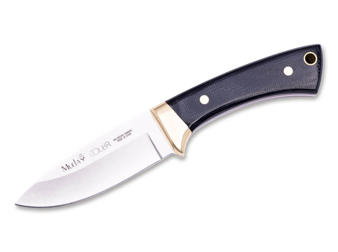 Das beliebte Muela Colibri macht in dieser modernen Variante ordentlich etwas her. Die Klinge aus X50CrMoV15 gibt sich für Jagd und Outdoor-Aktivitäten spielfreudig und ist dank Vollerlbauweise äußerst stabil. Sicheren Halt verspricht der Griff aus Micarta. Die Backe, Fangriemenöse und Nieten sind aus Messing gefertigt und verleihen dem Jagdmesser einen Hauch Retro. Lieferung mit hochwertiger Lederscheide.