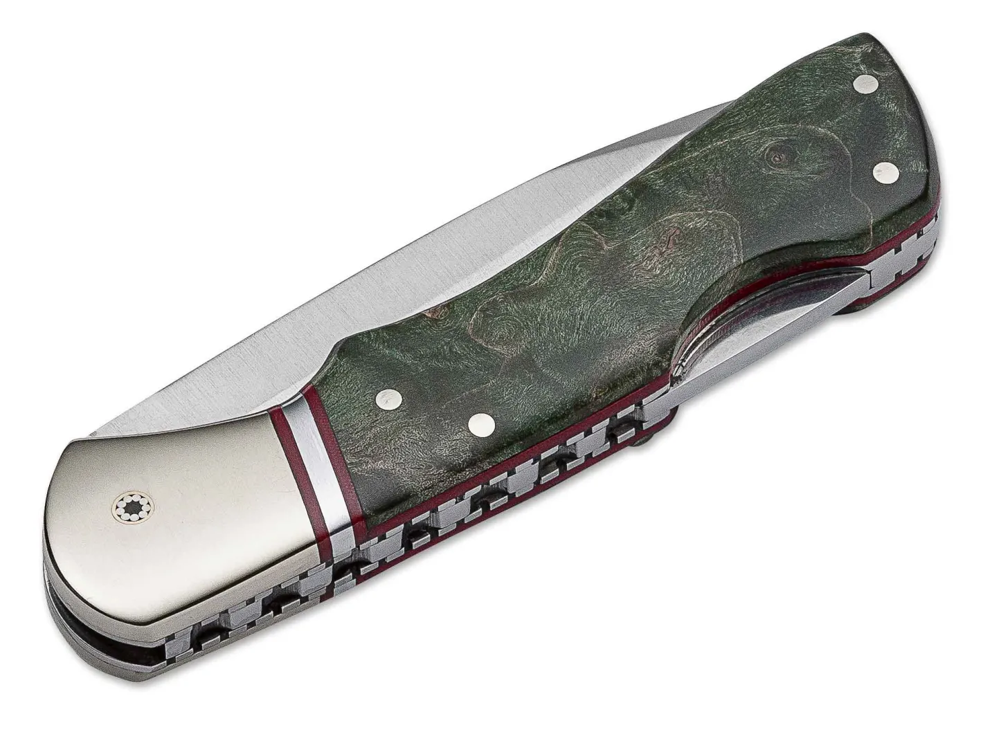 Mit ihren hochwertigen Jagdmessern Made in Spain und der hohen Fertigungstiefe ist Muela aus der Szene der klassischen wie auch der modernen Jagdmesser (und inzwischen auch zunehmend der Outdoor- und Bushcraftmesser) nicht mehr wegzudenken. Die Fähigkeit, Hirschhorn in einer Serienfertigung auf so konstant hohem Niveau zu verarbeiten, sucht seinesgleichen, und die Verwendung moderner Stähle wie z.B. dem stickstofflegierten Sandvik-Stahl 14C28N bei ausgesuchten Modellen zeigt, dass nicht nur Traditionen gepflegt werden, sondern auch ein ausgezeichnetes Gespür für die Bedürfnisse des Marktes vorhanden ist. Einen besonderen Akzent setzen auch die Lederscheiden, die ebenfalls von Muela selbst gefertigt werden und immer von höchster Qualität sind. Zum 60. Firmenjubiläum erfreut uns Muela mit einigen limitierten Sondermodellen, die mit besonders erlesenen Materialien und in edler Ausführung in einer Sammlerschatulle geliefert werden.Der aufwändig gearbeitete Griff des Maderas Anniversary besitzt eine Beschalung aus stabilisiertem Ahorn-Wurzelholz, das mit roten Fiberlagen unterlegt ist. Als besonderen Akzent verbaut Muela zwischen Beschalung und Neusilberbacke noch ein poliertes Distanzstück, das ebenfalls beidseitig von roter Fiber eingefasst ist. Sowohl die Rückenfeder wie auch die Edelstahlplatinen sind mit dekorativem Filework versehen, das sich bis zum Griffende fortsetzt. Die Vernietung der Klingenachse erfolgt mit einem Mosaikpin, eine absolute Seltenheit bei einem Messer dieser Bauart. Die satinierte Klinge aus 4116-Stahl wird per Lockback verriegelt. Auf der Neusilberbacke ist die individuelle Seriennummer aufgebracht. Limitiert auf 999 Exemplare weltweit.