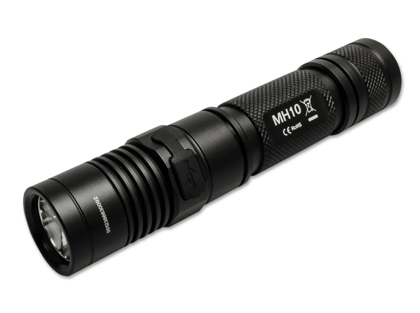 Mit der MH 10 liefert Nitecore eine kompakte Version der per USB aufladbaren MH-Serie. Mit ihren 1000 Lumen bietet die MH 10 Leistung satt bei kompakten Abmaßen, und der im Lieferumfang enthaltene Akku (Typ 18650) lässt sich mit dem mitgelieferten Standard-USB-Kabel einfach an jeder USB-Stromquelle aufladen (Handy-Ladegerät, USB-Buchse am Computer oder Notebook, USB-Buchse im Auto, Powerbank etc.). Falls keine Lademöglichkeit besteht, kann die Lampe auch mit 2 nicht aufladbaren Batterien Typ CR123 betrieben werden. Hartanodisiertes Aluminiumgehäuse, Cree XM-L2 U2-LED. Durchmesser 25,4mm. 4 Lichtstärken plus SOS, Stroboskop und Notblitz. Lieferung mit Li-Ion-Akku Typ 18650 (2300mAh), USB-Kabel, Handschlaufe, Gürteletui, Clip und Ersatzdichtung. Wasserdicht nach IPX-8.