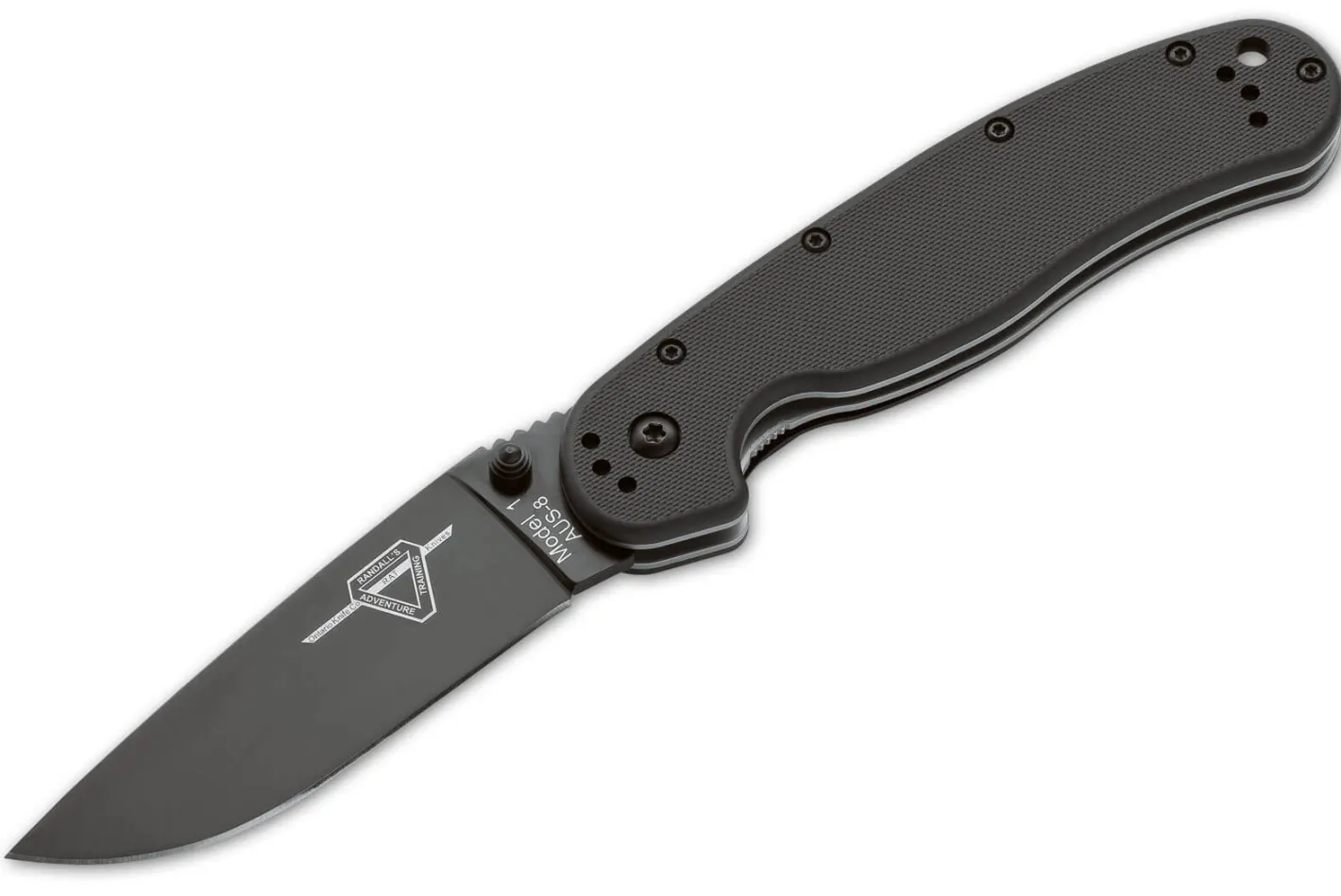 Plain Edge Folder aus der RAT Serie mit flach geschliffener Klinge aus AUS 8 Stahl mit abriebfester Beschichtung, abnehmbarem Daumenknopf, umsetzbarem Clip (4 Positionen), Fangriemenöse und ergonomisch geformten Schalen aus schlagfestem Nylon.