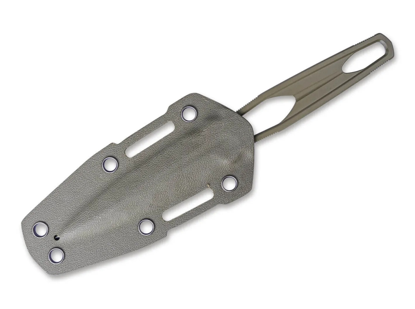 Der taktische Dolch aus der Feder von Ostap Hel ist mit einer beidseitig abgezogenen Spearpoint-Klinge aus K110 sowie einem grünen Cerakote-Finish zum Schutz vor Kratzern und zur Verminderung von Reflexionen. Geliefert wird das als Ganzstahlkonstruktion konzipierte Skelettmesser in einer passgenauen Kydexscheide.