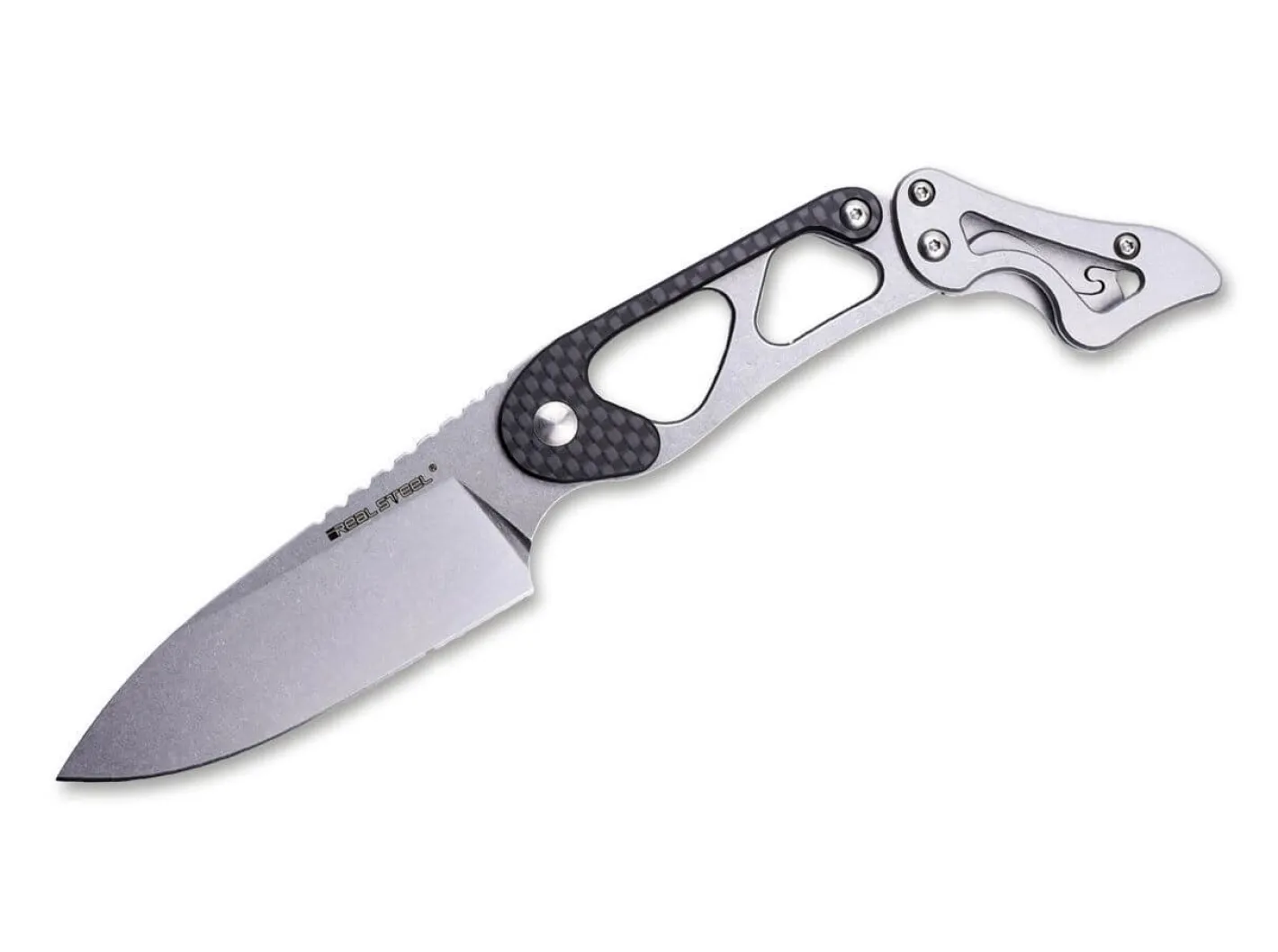 Das weiterentwickelte Cormorant Apex von Real Steel ist ein innovatives feststehendes Messer, das aufgrund des variablen Griffs mit einem breiten Einsatzspektrum glänzt. Das kompakte Messer kann problemlos als leichtes EDC oder auch Neck Knife getragen werden, bietet mit ausgeklappter Verlängerung aber die komfortable Handlage eines deutlich größeren Messers. Gefertigt wird die Ganzstahlkonstruktion mit Stonewash-Finish aus 14C28N, der skelettierte Griff mit Schalen aus Kohlefaser reduziert das Gewicht zusätzlich. Mit praktischer Kydex-Scheide.