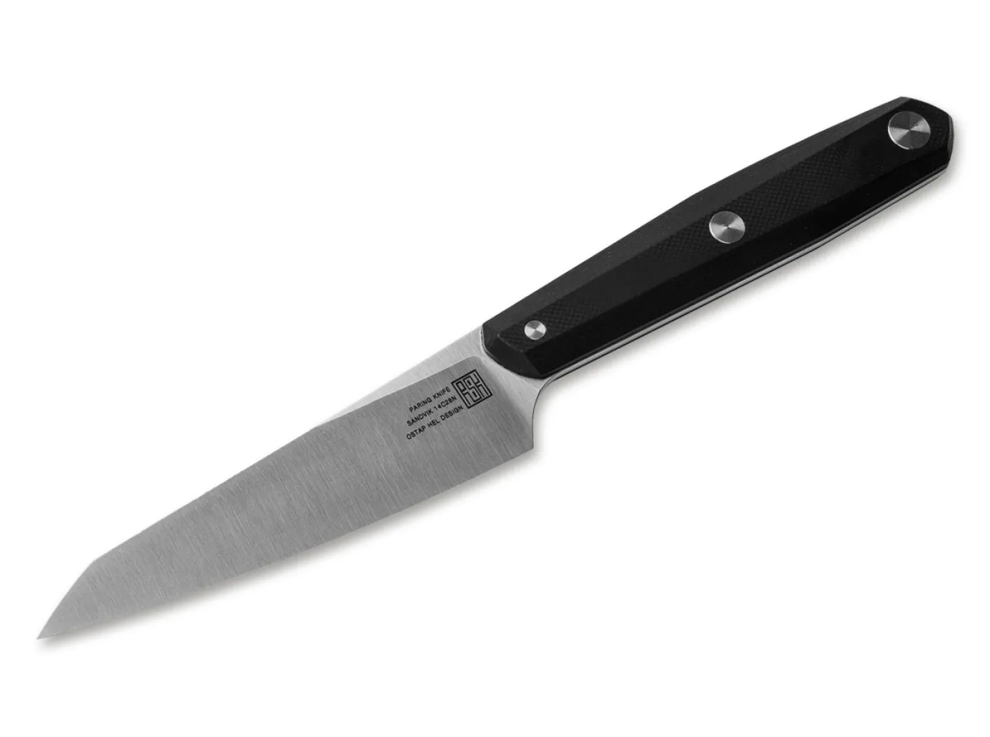 In Zusammenarbeit mit Ostap Hel hat Real Steel die Küchenmesserserie OHK entworfen, in der das Design von Ostap Hel von zentraler Bedeutung ist. Die Linienführung ist geradlinig und auf ein Minimum reduziert. Das Schaftdesign mit rundem Rücken verstärkt die Ästhetik dieser Serie. Der Klingenstahl 14C28N sorgt für eine fantastische Schärfe, Korrosionsbeständigkeit und einfaches Nachschärfen. Die CNC-gefertigten Griffe aus G10 mit starken, stoßfesten Nieten sind robust und liegen angenehm in der Hand.Das OHK Schälmesser eignet sich bei kleineren Produkten perfekt zum Trimmen, Schneiden und für feinere Detailarbeiten.