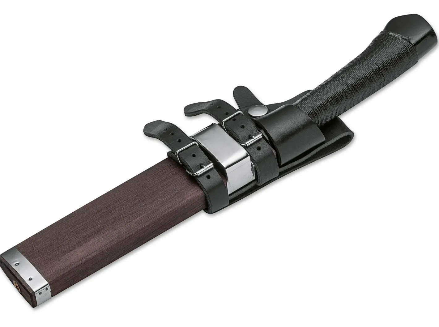 Yoshihiko Akimoto ist Messerschmied in der dritten Generation in Seki in Japan. Der Familienbetrieb Red Orca wurde von seinem Großvater Yoshiharu Akimoto (geb. 1896) gegründet und fertigt seitdem hochwertige geschmiedete Klingen für unterschiedliche Anwendungen. Das Ken-Nata ist als Universalwerkzeug für den Outdoorgebrauch konzipiert und fungiert als kleine Machete ebenso wie als größeres Camp- oder Jagdmesser. Ein Kern aus dem klassisch-japanischen Shirogami-2-Stahl (weißer Papierstahl, nicht rostfrei) wird mit weicheren Seitenlagen verschmiedet, um trotz der hohen Härte der Klinge Flexibilität und Belastbarkeit zu gewährleisten. Die Klinge des Ken-Nata ist ballig auf Null geschliffen, ohne separate Schneidfase. So paart sich exzellente Schärfe mit Stabilität. Der Griff und die Scheide sind traditionell aus Holz gefertigt. Während die Griffwicklung mit Kunstharz fixiert ist, besitzt die Scheide eine abnehmbare Leder-Gürtelschlaufe. Das Ken-Nata versteht sich also keineswegs als reines Vitrinen- oder Sammlerstück, sondern auch als hochwertiges Gebrauchsmesser, das die jahrhundertealte Schmiedekunst Japans auch in der Gegenwart auf das Lebendigste verkörpert.