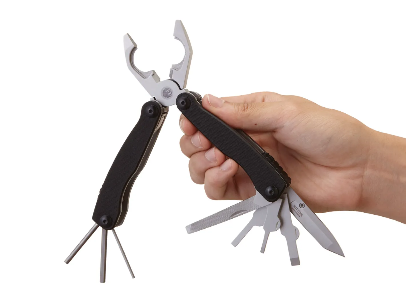 Das perfekte Multitool für alle Sportschützen mit einer Pistole Modell 1911. Diese ursprünglich als Colt Government im Jahr 1911 bei der US Army eingeführte Dienstpistole hielt sich bis zum Jahr 1985 und hat somit eine beeindruckende Dienstzeit von 74 Jahren absolviert. Heutezutage wird die Pistole 1911 von zahlreichen Herstellern weltweit gefertigt. Der Zangenkopf des 1911 Tool ist speziell zum Lösen der vorderen Laufführungsbuchse (Bushing) konzipiert und erleichtert die Demontage der Pistole erheblich, dient aber auch als kleine Kombizange. Zusätzlich ist das Tool mit einer Tantoklinge mit Linerlock, 3 Schlitzschraubendrehern, einem Durchschlag, einer Feile, einem Drahtschneider und -abisolierer und zwei Innensechskantschlüsseln (3/32″ und 5/32″) ausgestattet. Die griffige G10-Beschalung sorgt für Rutschsicherheit, und das im Lieferumfang enthaltene Nylonetui für sicheren Transport.