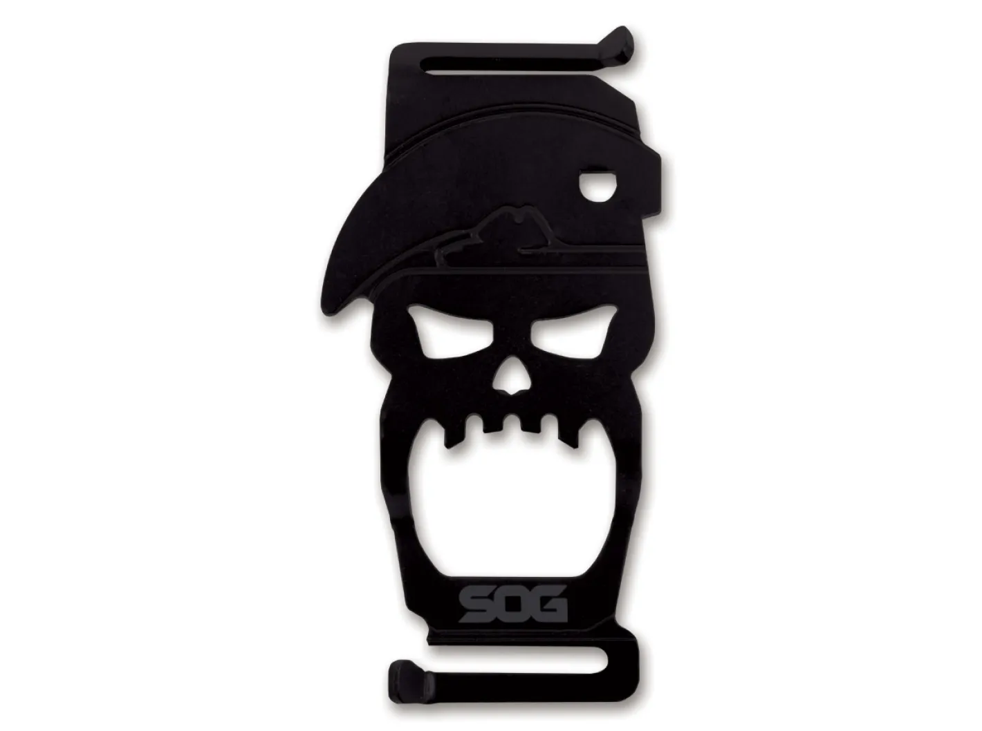 Der Flaschenöffner Bite gehört zu den kleinen durchdachten Accessoires, die man nicht haben muss, die aber einfach Spaß machen. Auf Basis des SOG-MACV-Logos beißen sich die Zähne des stilisierten Totenkopfes sicher in den Kronkorken. Das Bite kann mit den Ösen leicht an MOLLE-Schlaufen oder anderen Riemen befestigt werden.