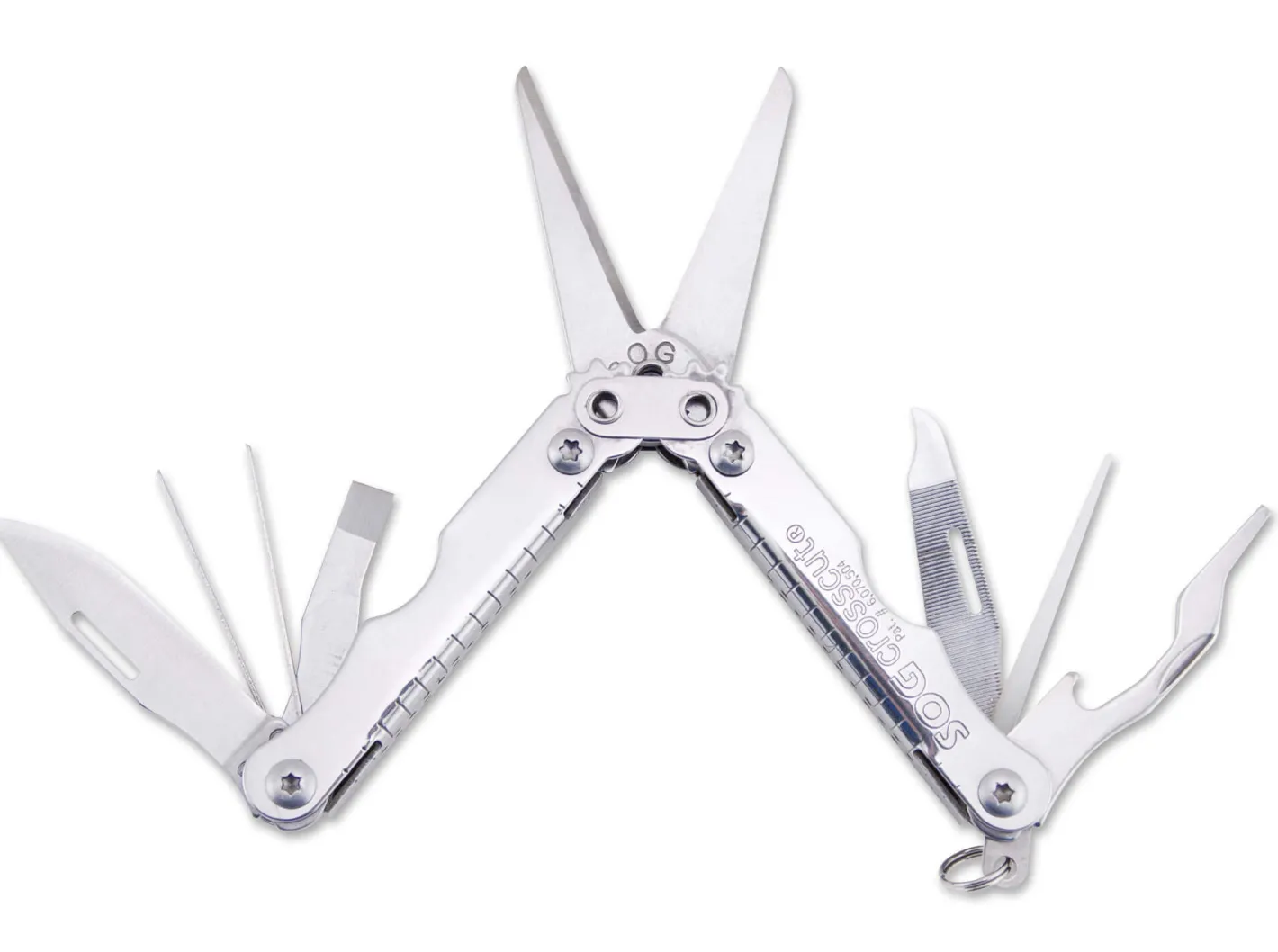 Viel kleiner kann man ein hochfunktionales Multitool für den Schlüsselbund kaum gestalten. Die Schere funktioniert wie fast alle Zangenköpfe der SOG Tools mit einer Übersetzung, d.h. man kann im Vergleich zu einer starren Verbindung die doppelte Kraft aufbringen. Zur weiteren Ausstattung gehören Messerklinge, 2 Schlitzschraubendreher, Flaschenöffner, Nagelfeile und Nagelreiniger, Pinzette und Zahnstocher. Ausklappbare Fangriemenöse mit Schlüsselring. Komfortables Schneiden durch die Feder der Schere. Zentimeter- und Zollskala.