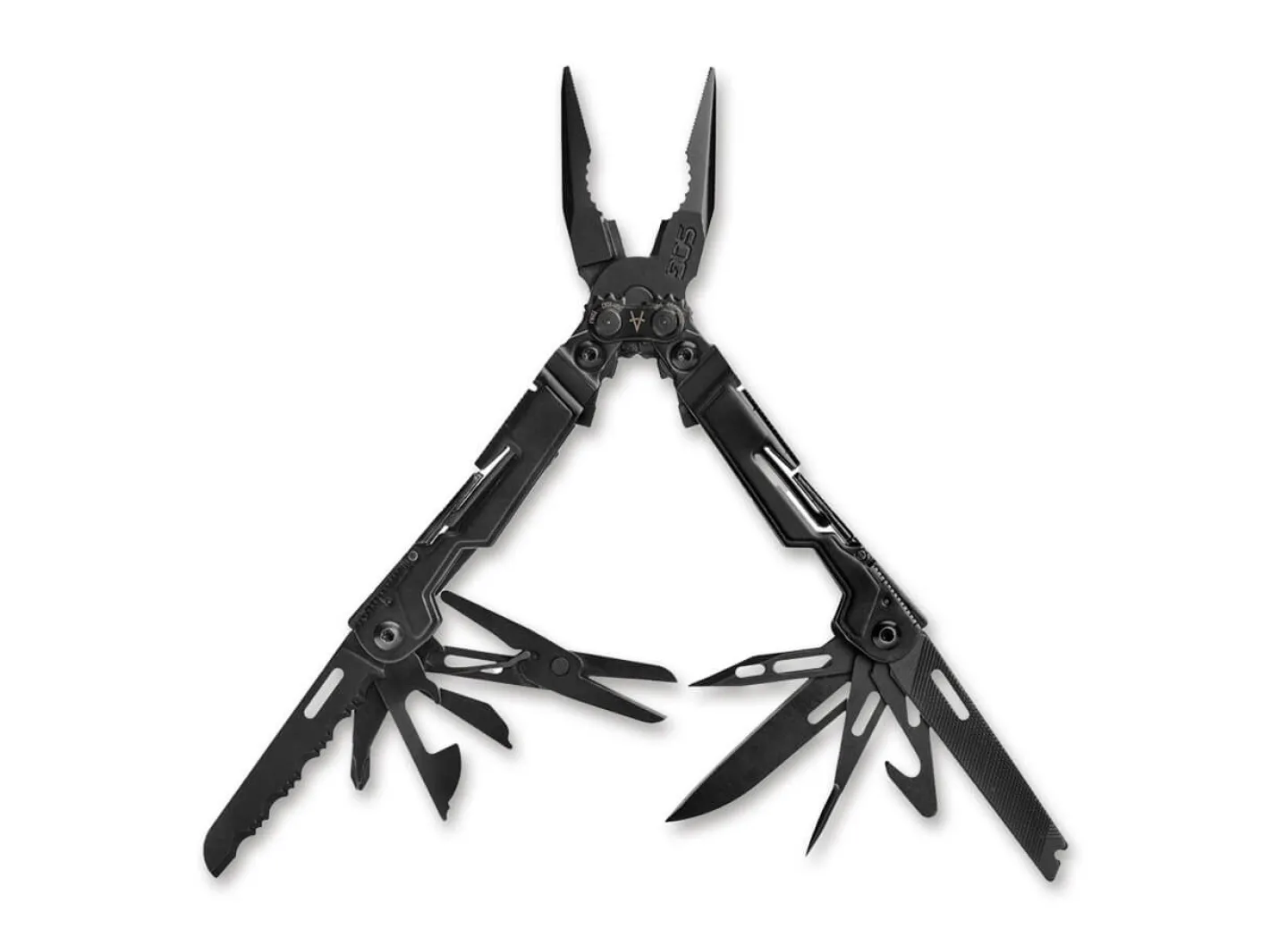 Das taktisch schwarze SOG PowerPint ist ein vollwertig ausgestattetes Multitool mit 18 Funktionen, das angesichts seiner umfangreichen Funktionen und der überaus belastbaren Konstruktion mit einem Gewicht von schlanken 119 Gramm überrascht. Der Zangenkopf mit der bewährten kraftsteigernden Zahnkranzübersetzung enthält vorn die flache Greiffläche als Spitzzange, dann das sogenannte Brennerloch zum Greifen von Außensechskantschrauben, Rohren und Überwurfmuttern, sowie die Schneidfläche mit Hart- und Weichdrahtschneider. Weitere Funktionen sind: Sheepfoot-Messerklinge mit Wellenschliff, Schere; Gurt- und Leinenschneider, Phillips-Schraubendreher # 1, Stech- und Bohrahle, Feinmechaniker-Schraubendreher, kleiner Schlitzschraubendreher, Dreiseitenfeile, Hex-Bit-Halter (1/4“), Lineal in Inch und Zentimeter, Dosen- und Flaschenöffner.