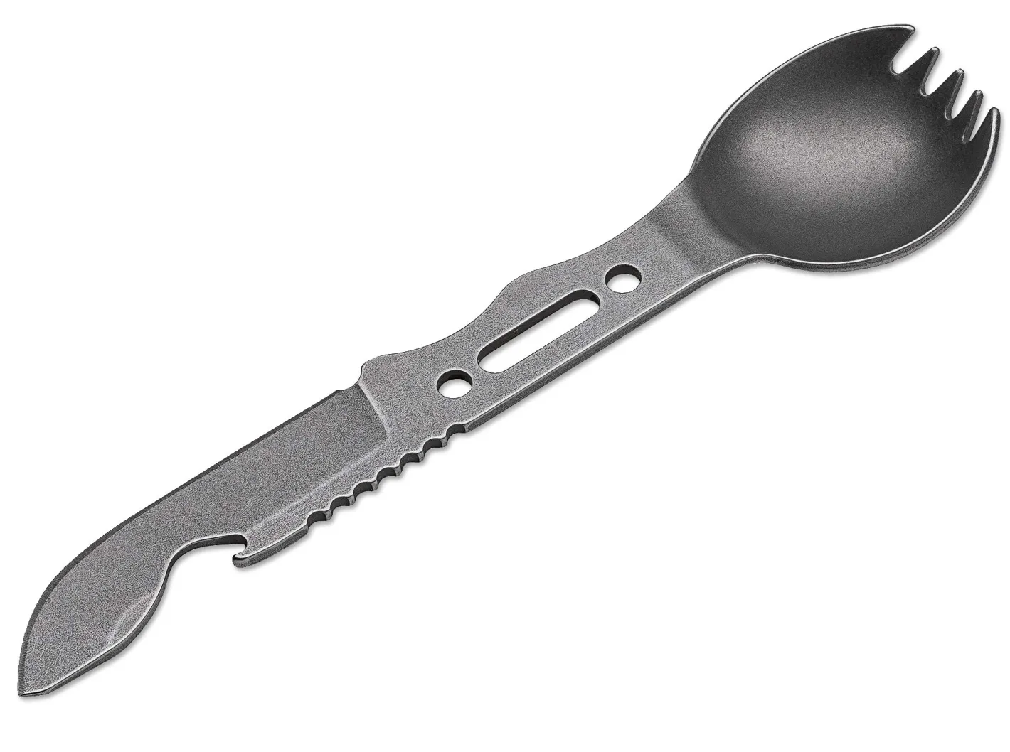 Leo Espinoza hat dieses multifunktionale Esswerkzeug als leichtgewichtiges und vielseitiges Werkzeug für Camper, Soldaten, Rucksacktouristen und Hiker entwickelt. Das F.O.R.K. IT bietet Gabel, eine vollwertige Messerklinge, Löffel und Kapselheber. Die Ganzstahlkonstruktion wird aus 1095 Kohlenstoffstahl gefertigt und mit einem Stonewash-Finish versehen. Lieferung mit Kydex-Scheide und Kugelkette. Die Scheide besitzt eine Aussparung, so dass der Kapselheber ohne Verletzungsgefahr genutzt werden kann.
