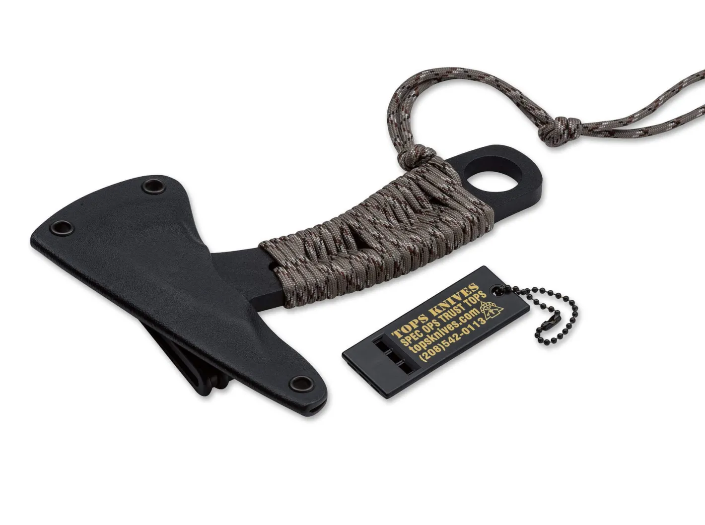Shawn Owens besitzt nicht nur einen großen Erfahrungsschatz aus dem Bereich „Martial Arts“. Vor allem seine Tätigkeit als Pilot hat ihn zu dem Entwurf dieses Tomahawks, dem Micro Hawk, inspiriert. Essentiell für Flugausrüstung sind natürlich geringes Gewicht und kompakte Abmessungen. Die außerordentliche Kompaktheit des Micro Hawk ermöglicht ein sehr platzsparendes Unterbringen und ein komfortables Führen, wobei die satten 8,3 mm Stahl trotz der geringen Baugröße des Micro Hawk für effektive Handhabung und Wucht beim Hacken sorgen. Die extreme Stabilität und Zuverlässigkeit wird natürlich auch durch den verwendeten 1095 Kohlenstoffstahl mitgeprägt. Mit dem rundherum abgezogenen Axtkopf kann das Micro Hawk auch hervorragend als Messer, Schaber etc. eingesetzt werden. Es kann mit seiner erstklassigen Kydexscheide mit drehbarem Clip bequem am Gürtel oder an der Ausrüstung getragen werden. Ein durchdachtes Werkzeug, das in keinem Notfallset oder Outdoor- Pack fehlen sollte. Die Auslieferung erfolgt mit einer Notfall-Signalpfeife.