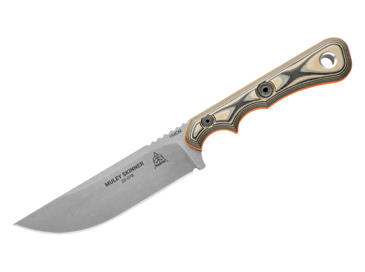 Das TOPS Knives Muley Skinner ist ein hochwertiges Messer mit feststehender Klinge, das sich perfekt für den Outdoor-Einsatz und die Jagd eignet. Die Klinge besteht aus rostfreiem 154CM-Stahl, während die schwarz-braunen Griffschalen aus unverwüstlichem G10 gefertigt sind. Die orangefarbenen Liner bilden einen gelungenen Kontrast zum schlangenartigen Muster des Griffs.Die lange, dickbauchige Klinge des Muley Skinner eignet sich hervorragend zum Häuten, aber auch für für das Camping, wie zum Beispiel dem Anzünden von Holz oder die Verarbeitung von Fleisch und Gemüse für die wohlverdiente Mahlzeit. Mitgeliefert wird eine passgenaue und unverwüstliche Kydexscheide. Made in USA.