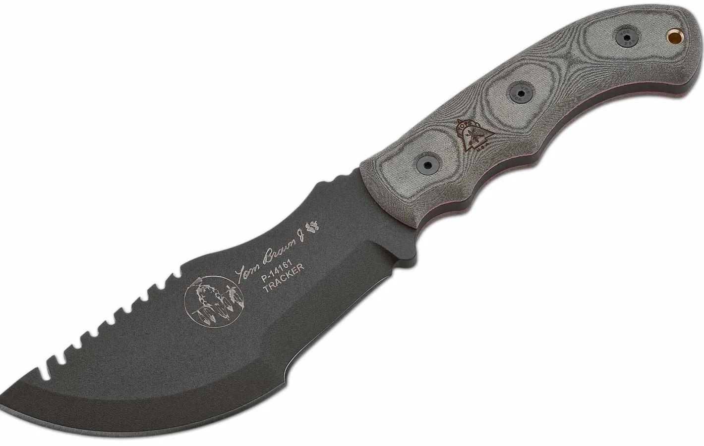 Die Modellserie Tracker wurde vom bekannten Fährtenleser und Survival-Experten Tom Brown II entwickelt, der seit 1978 eine feste Größe in der Szene ist. Die Tracker Modelle spiegeln sein geballtes Knowhow wider und überzeugen mit 1095 Kohlenstoffstahlklingen mit Black Traction Coating. Das wohl bekannteste Messer im TOPS Produktsortiment, bekannt aus dem Kinofilm „Die Stunde des Jägers“. Ein wuchtiges Survival-Messer zum Hacken, Schneiden, Schaben, Sägen, Graben, Hebeln etc. ausgestattet mit 1095er Kohlenstoffstahlklinge und Black Traction Coating und Griffschalen aus Leinen Micarta. Die Scheide aus Kydex kann dank zweier drehbarer Stahlclips konventionell am Gürtel aber auch im Scout-Style quer am Rücken getragen werden.