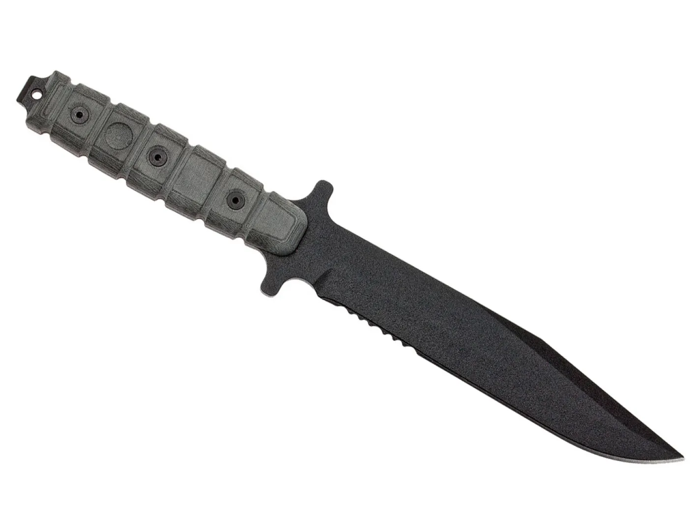 Das von dem ehemaligen Marine Laci Szabo entworfene US Combat Knife ist mit einer beschichteten Klinge aus nicht rostfreiem 1095 Kohlenstoffstahl ausgestattet. Der ausgeprägte Handschutz erhöht die Sicherheit beim Schneiden. Der strukturierte Griff aus rutschfestem Micarta liegt optimal in der Hand. Trotz des militärischen Hintergrundes ist das massive Messer auch für alle Outdooraktivitäten bestens geeignet. Mit Schlagstück, Fangriemenöse und praktischer Nylonscheide.