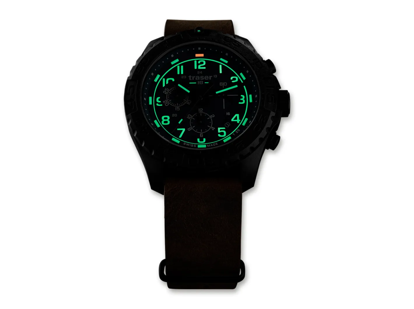 Die Traser P96 OdP Evolution ist der ideale Zeitmesser für Entdecker und Outdoor-Enthusiasten, der bei keinem Abenteuer fehlen darf. Extrem leicht, zäh und robust – diese Eigenschaften charakterisieren die sportliche P96 Outdoor Pioneer am besten. Zusätzliche Robustheit verleiht der P96 ein widerstandsfähiges glasfaserverstärktes Polymer-Gehäuse. Die Ablesbarkeit bei Nacht ist durch die hauseigene Selbstleuchttechnologie trigalight jederzeit gewährleistet.Die Uhr hat einen Durchmesser von 44 Millimetern und ist mit anti-reflektierendem, kratzfestem Saphirglas und einem Original Swiss Made Quarz Chrono Uhrwerk ausgestattet. Die grünen Ziffern und Uhrzeiger sitzen auf einem grauen Ziffernblatt. Das hochwertige Leder-Armband ist angenehm zu tragen. Die Uhr verfügt über eine Stoppfunktion und ist wasserdicht bis 20 bar oder 200 Meter. Die trigalight Selbstleuchttechnologie erleuchtet Index 1 bis 11 in grüner Farbe und Index 12 in orangener Farbe. Zusätzlich ist die einseitig drehbare Lünette mit Super-LumiNova beschichtet.