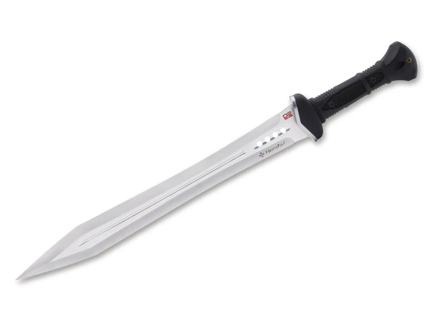 Nur die stärksten und tapfersten Gladiatoren ernteten nach ihren aufreibenden Kämpfen Ruhm und Respekt vom Imperator und Pöbel. Zu den Standardwaffen der antiken Berufskämpfer zählte einst der Gladius, das wohl bekannteste römische Schwert. United Cutlery lässt das alte Rom wiederaufleben und präsentiert das Honshu Gladiator Sword. Seine Klinge aus rostfreiem D2-Stahl ist mit einer Hohlkehle und gewichtsreduzierenden Durchbrüchen versehen. Der strukturierte und geriffelte Griff aus spritzgegossenem TPR liegt sicher in der Hand, während das typisch kurze Parierelement und der Knauf am Griffende das historische Profil abrunden. Lieferung mit hochwertiger Lederscheide.